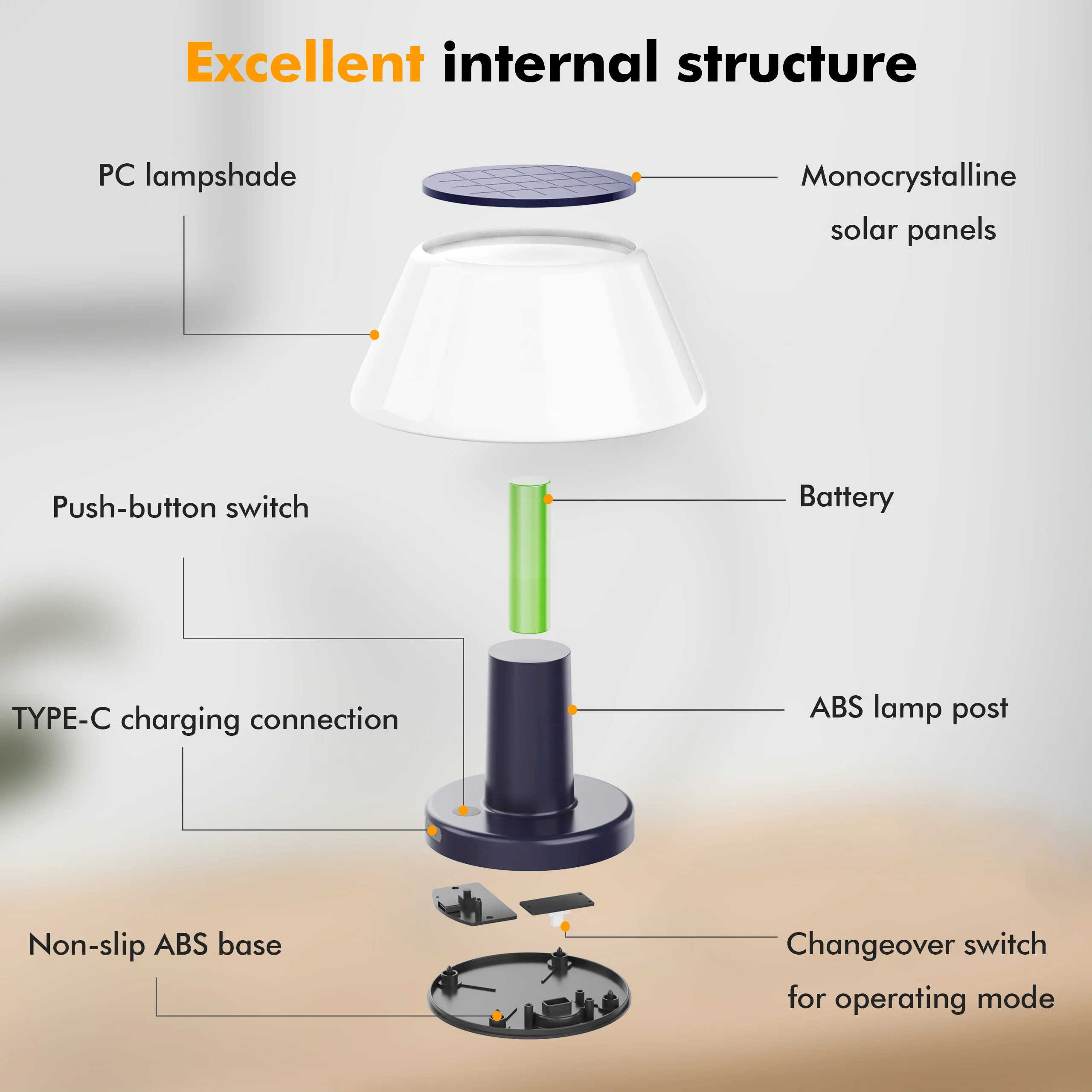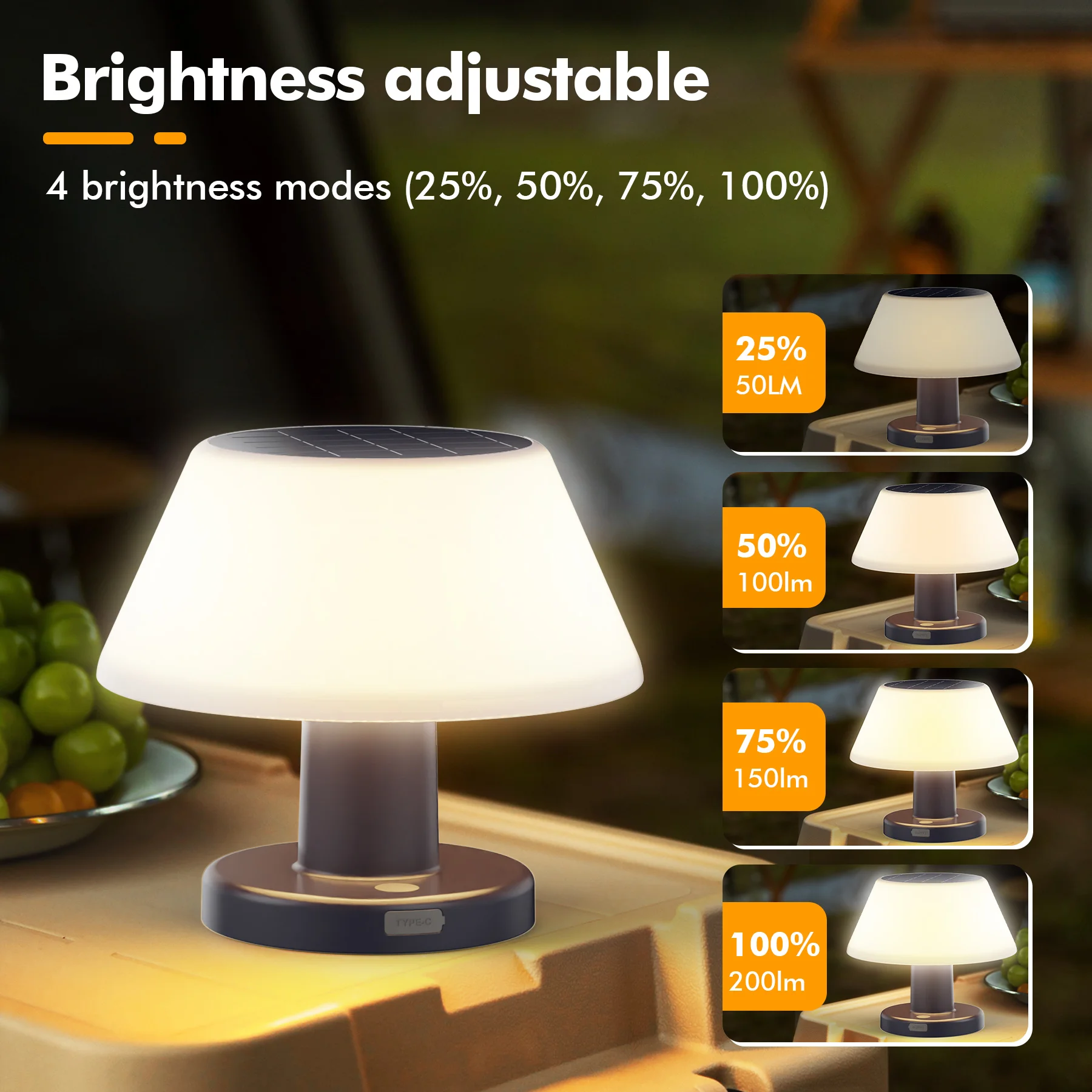 Powered by an efficient polycrystalline solar panel and supported by USB-C fast charging, LunaGlow offers 4 adjustable brightness levels (50–200 lm), allowing you to create the perfect warm atmosphere for outdoor dinners, relaxing nights, or soft indoor lighting. Its naturally diffused warm white light makes it ideal for warm light living rooms, aesthetic bedrooms, and ambient night-time décor.